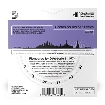 Referred to as Custom Light, EJ26 strings are a D'Addario original hybrid gauge and a comfortable compromise for players who want the depth and projection of light gauge bottom strings, but slightly less tension on the high strings for easy bending. Buy 3 sets and save!